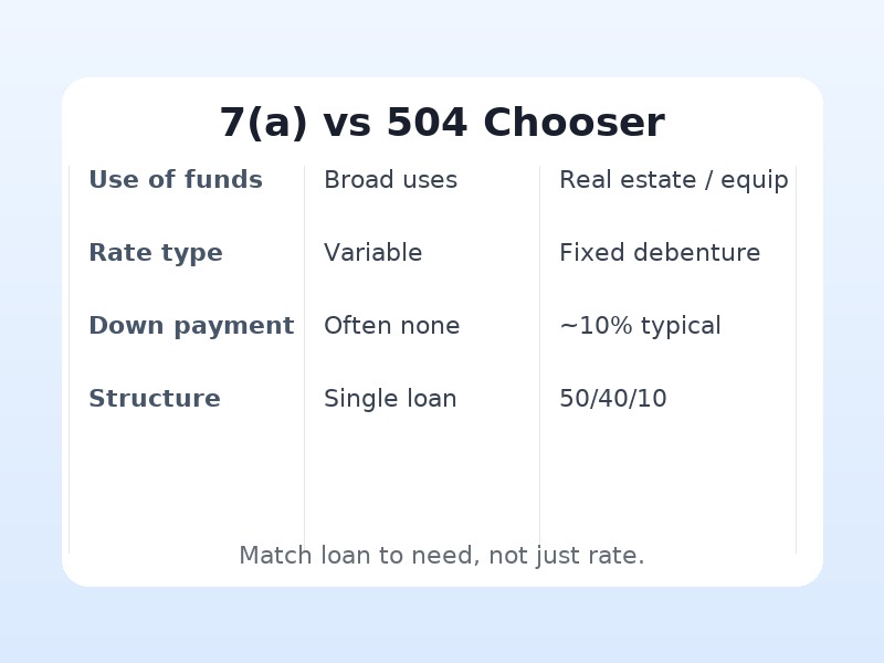 Use of funds drives fit. Choose 7(a) when needs are blended or working-capital heavy. Choose 504 when the anchor is real estate or machinery. Mixed projects can split if needed.