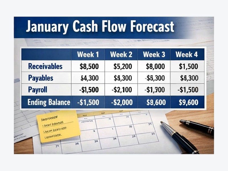 Begin with a simple January cash flow forecast built from known items. Use invoice due dates, contract billing dates, and expected processor payout timing. List payroll, rent, debt service, insurance, and key vendor payments by due date. The output should show weekly liquidity, not only monthly totals.
